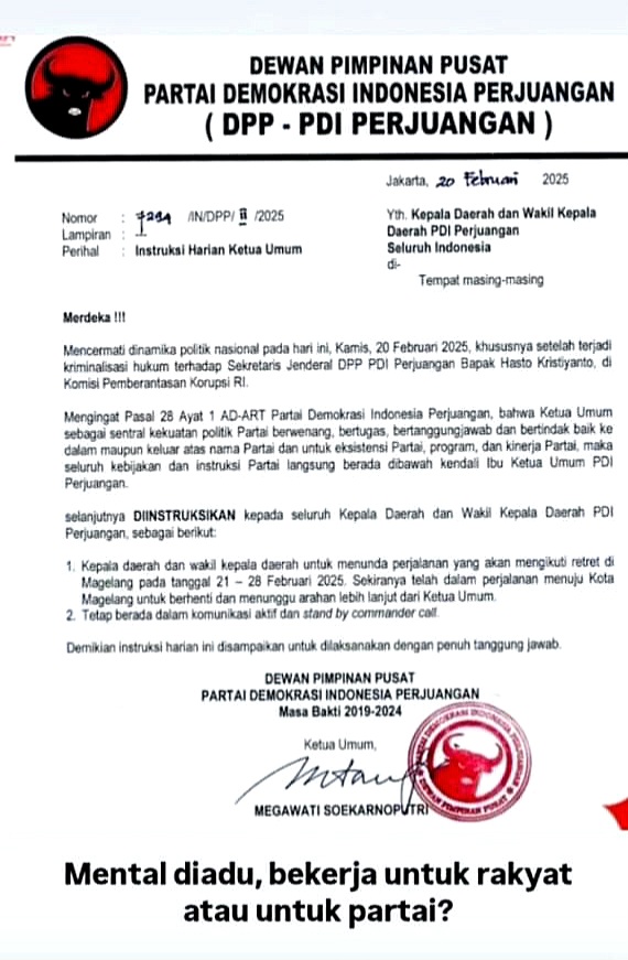 Instruksi yang tertuang dalam surat edaran Nomor 7294/IN/DPP/II/2025, Intruksi Harian Ketua Umum Dewan Pimpinan Pusat Partai Demokrasi Indonesia Perjuangan (DPP-PDI Perjuangan) Ketua Umum Megawati Soekarnoputri memberikan Intruksi,