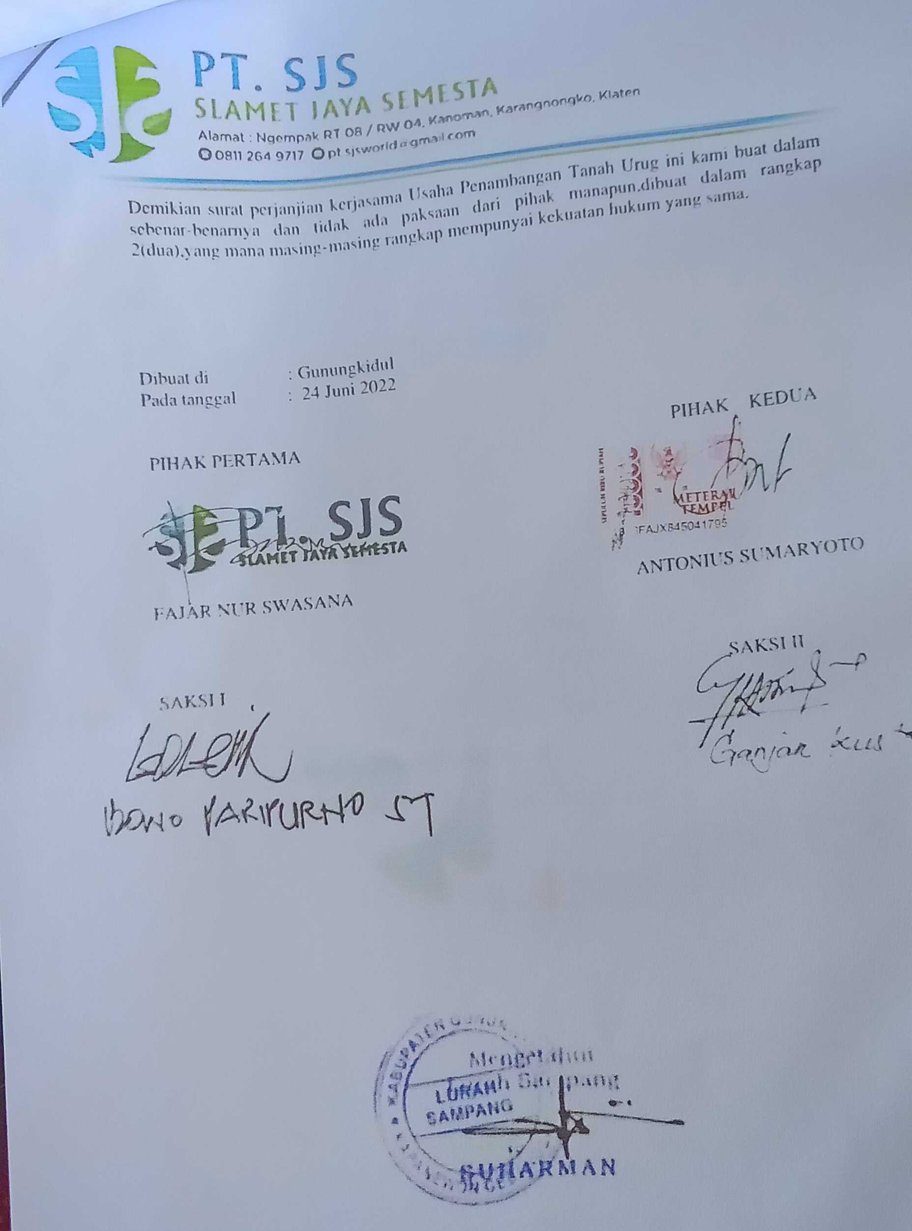 Bahwa belakangan dirinya ketahui ternyata Fajar Nur PT SJS melakukan perjanjian sendiri pada tanggal 24 Juni 2022 dengan pihak Maryoto yang dibubuhi tanda tangan Suharman sebagai Kepala Kalurahan Sampang berstempel dengan mengatasnamakan PT Pueser Bumi ada didalamnya yang padahal pada tanggal itu Fajar PT SJS belum melakukan perjanjian dengan PT PUESER BUMI.