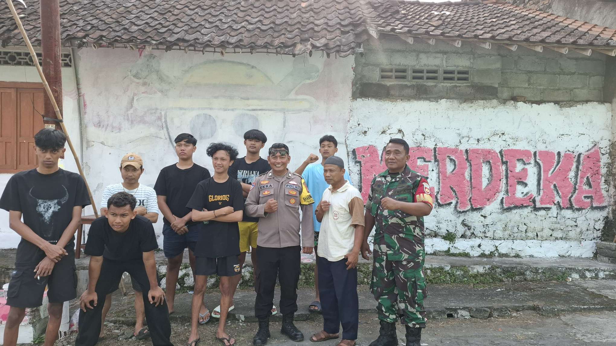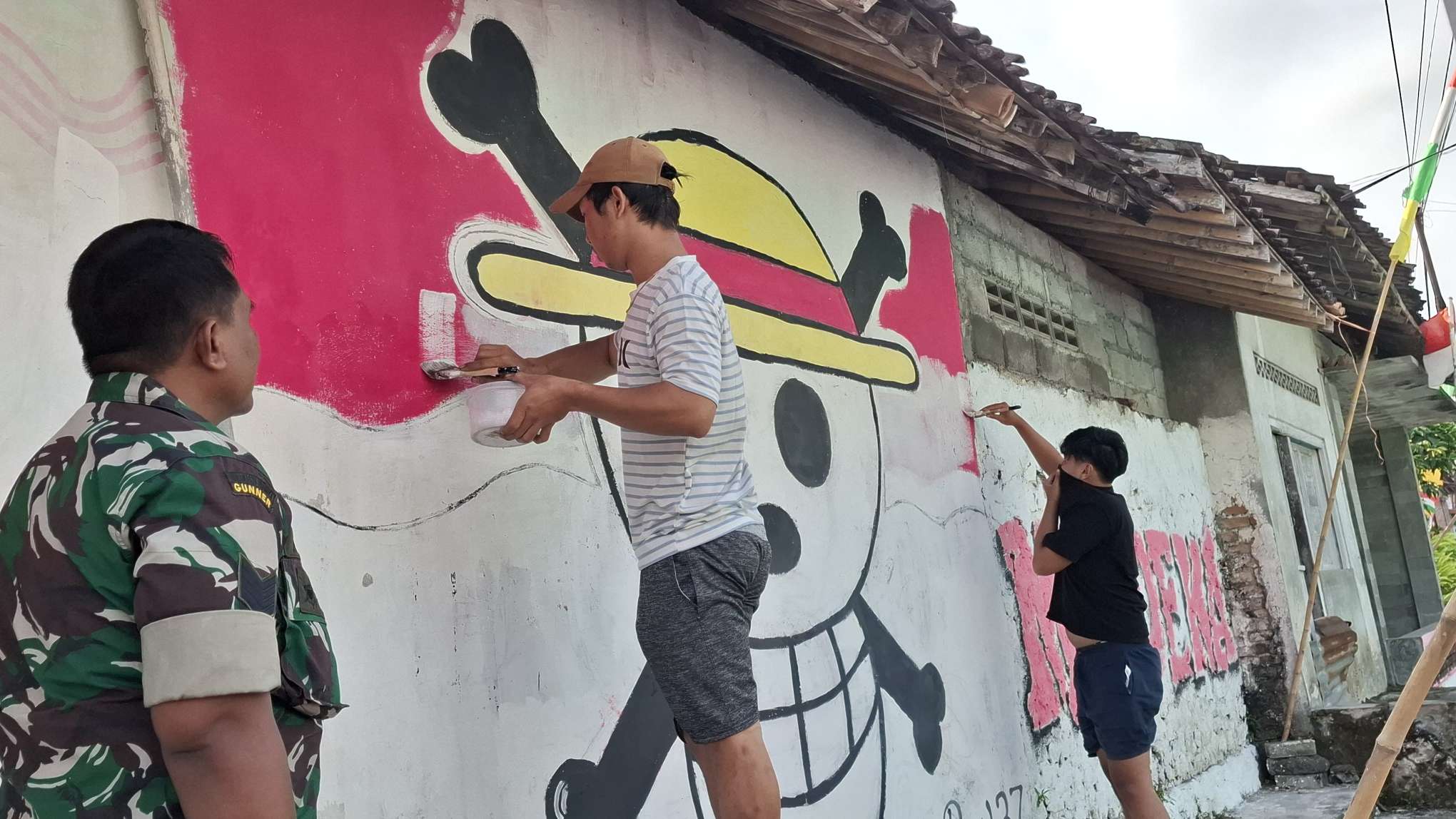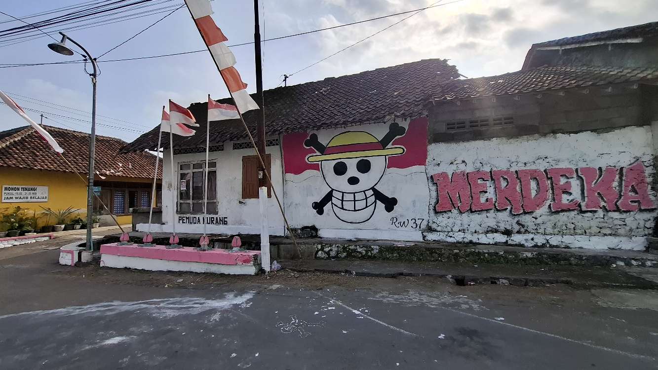 SLEMAN, DIY || WARTA-JOGJA.COM – Setelah viralnya di media sosial ditemukannya mural bajak laut dari anime One Piece di wilayah Balecatur, Gamping, Kabupaten Sleman, DIY. Kali ini, sebuah mural bertema One Piece yang ditemukan di tembok rumah warga di Jl. Temulawak, RT 7 RW 37, Padukuhan Temulawak, Kalurahan Triharjo, Kapanewon Sleman, Kabupaten Sleman, menuai perhatian aparat setempat. Terdapat dua simbol yaitu yanh satu berlambang tengkorak dengan topi jerami yang turut dituliskan kata Merdeka. Sementara gambar satunya dituliskan STRUGGLE.