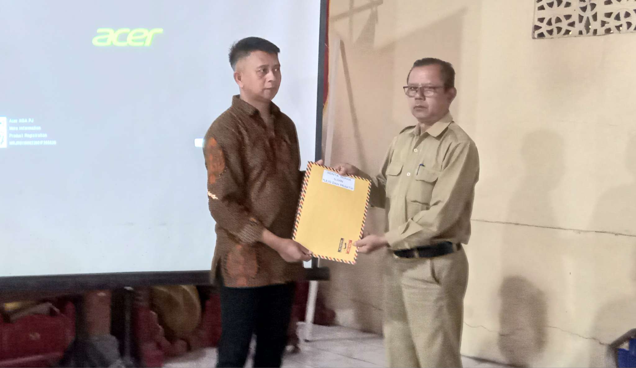 Ketua Tim Penguji, Novianto, S.E, bersama Sekretaris David Iskandar, S.Pd, menyerahkan berita acara hasil ujian kepada Lurah Purwodadi usai pelaksanaan seleksi.
