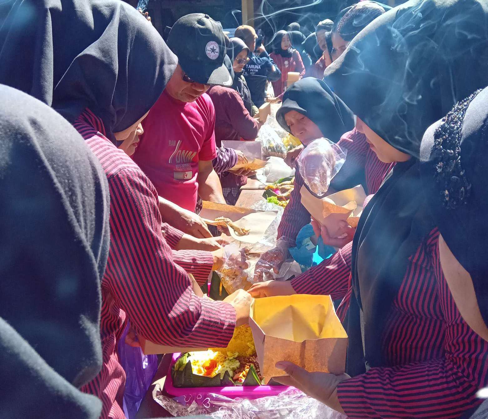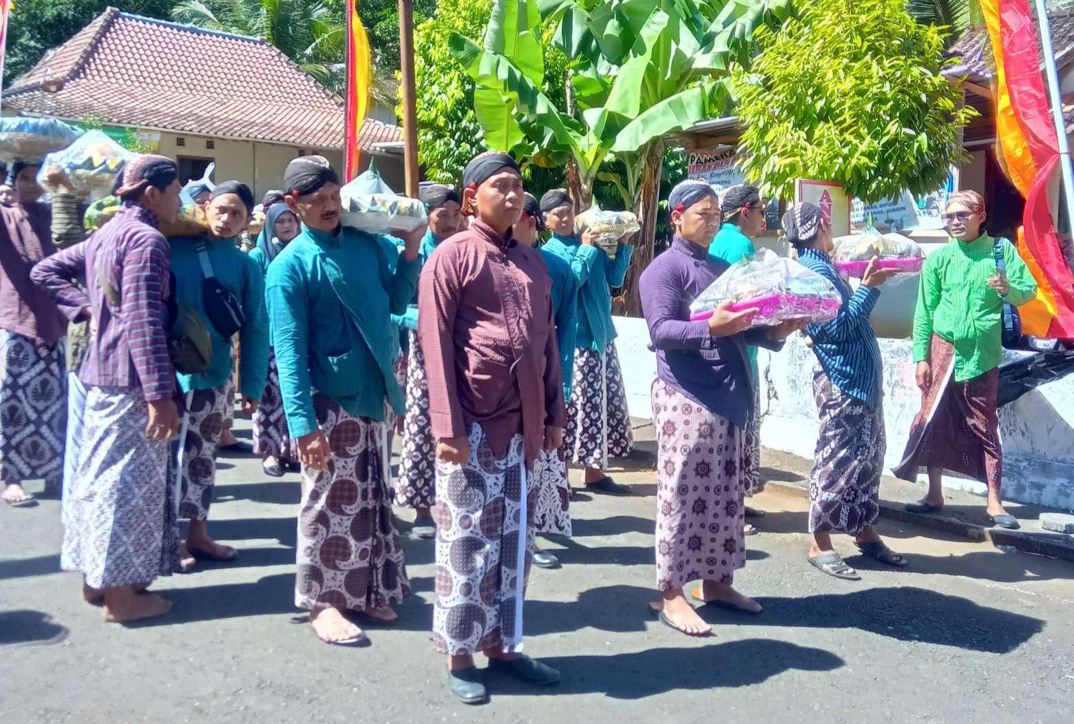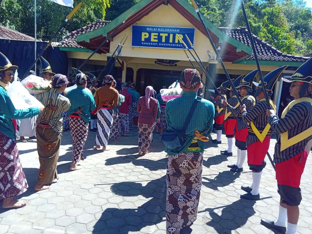 Warga masyarakat dari dari 13 Padukuhan se-Kalurahan Petir nampak rapi melakukan kirab dengan membawa tumpeng berjalan beriringan yang diiring oleh bergodo Guntur Rumekso dari Balai Padukuhan Petir A menuju halaman Balai Kalurahan.